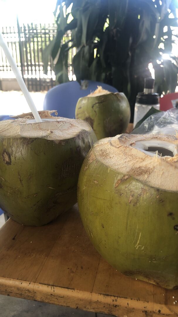 Chạy tiếp đến Phù Mỹ khoảng 11h45, em kiếm quán cafe võng dừng chân nghỉ trưa. Mọi người gọi dừa để uống đồng thời ăn trưa bằng đồ ăn đã chuẩn bị từ sáng.