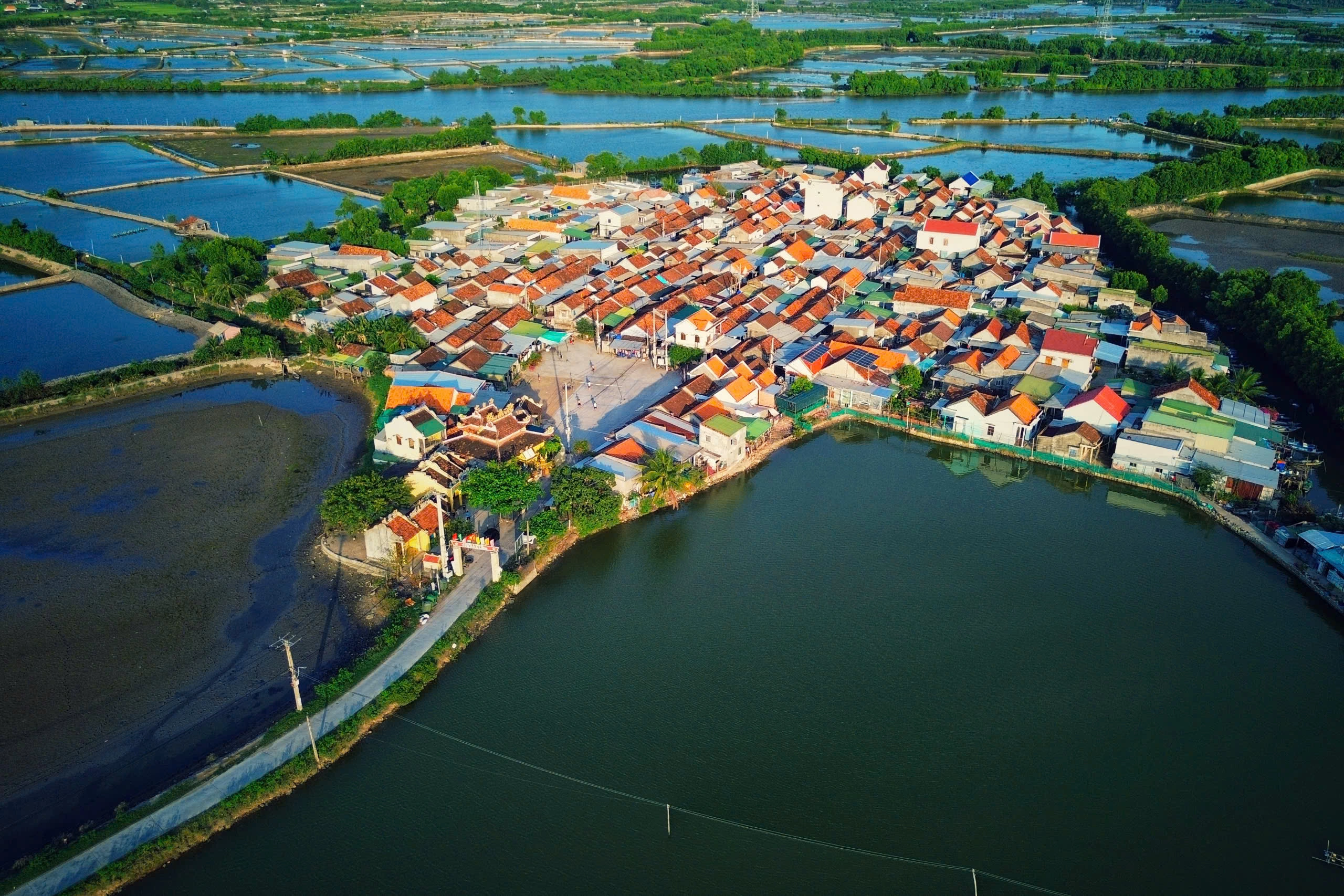 Điểm đặc biệt của những tấm ảnh trên cao, làng Hà Liên hiện lên như một ốc đảo, nổi bật giữa những hồ nuôi thủy sản và hệ thống rừng ngập mặn xung quanh.