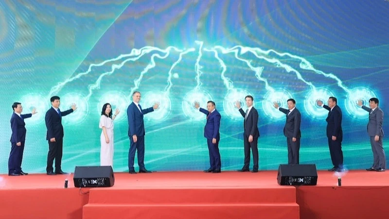 Các đại biểu bấm nút chính thức vận hành thương mại đoạn trên cao đường sắt đô thị Nhổn-ga Hà Nội. |