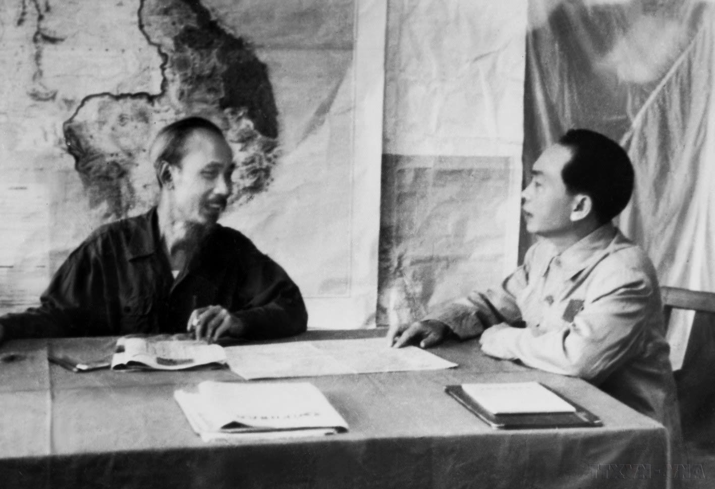 Thay mặt Trung ương Đảng và Chính phủ, Chủ tịch Hồ Chí Minh trực tiếp giao nhiệm vụ cho Đại tướng Võ Nguyên Giáp nghiên cứu kế hoạch tác chiến và mở chiến dịch Điện Biên Phủ. (Ảnh: TTXVN)