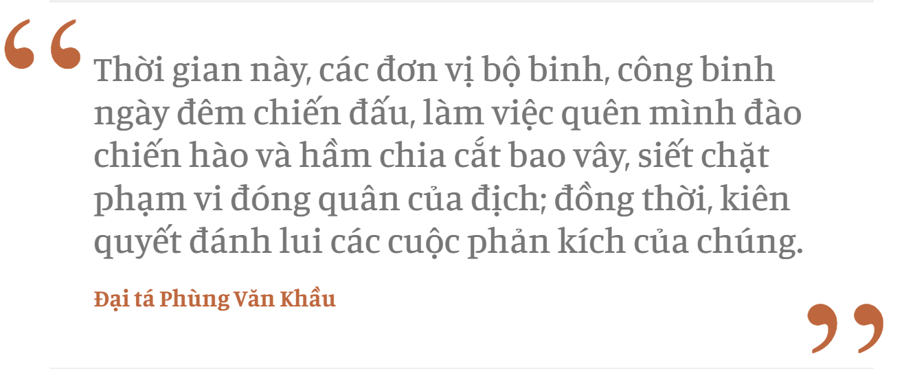 Thời gian này, các đơn vị bộ binh, công binh ngày đêm chiến đấu, làm việc quên mình đào chiến hào và hầm chia cắt bao vây, siết chặt phạm vi đóng quân của địch; đồng thời, kiên quyết đánh lui các cuộc phản kích của chúng. Cuộc chiến đấu giữa ta và địch diễn ra vô cùng ác liệt, một vài anh em có biểu hiện dao động, tôi có lúc tưởng chừng không sống nổi. Được sự giáo dục, động viên kịp thời của cán bộ cấp trên và đồng đội, chúng tôi kiên cường bám trụ, vượt qua khó khăn gian khổ, củng cố lực lượng và tinh thần, quyết tâm hoàn thành nhiệm vụ, góp phần giành toàn thắng cho chiến dịch.