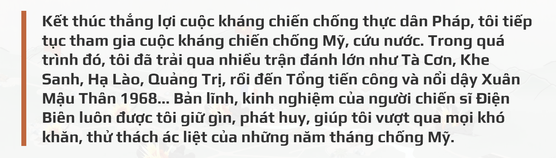 Kết thúc thắng lợi cuộc kháng chiến chống thực dân Pháp, tôi tiếp tục tham gia cuộc kháng chiến chống Mỹ, cứu nước. Trong quá trình đó, tôi đã trải qua nhiều trận đánh lớn như Tà Cơn, Khe Sanh, Hạ Lào, Quảng Trị, rồi đến Tổng tiến công và nổi dậy Xuân Mậu Thân 1968... Bản lĩnh, kinh nghiệm của người chiến sĩ Điện Biên luôn được tôi giữ gìn, phát huy, giúp tôi vượt qua mọi khó khăn, thử thách ác liệt của những năm tháng chống Mỹ. Tôi luôn tâm niệm một điều, phải sống, chiến đấu sao cho xứng đáng với sự tin tưởng của Đảng, của Bác Hồ kính yêu và xứng đáng với những đồng đội đã khuất. Ngoài mặt trận, đối diện với hiểm nguy, nhưng nhìn thấy đồng đội bị thương vong, nhìn vào tấm Huy hiệu Bác Hồ trên ngực, tôi vẫn luôn bình tĩnh chiến đấu. Cho dù một mình một pháo cũng đánh. Đó là niềm tin luôn trong tôi khi tham gia Chiến dịch Điện Biên Phủ và kháng chiến chống Mỹ. Khi mình còn sống nghĩa là còn có cơ hội tiêu diệt thêm quân thù, mang lại hòa bình, tự do cho Tổ quốc, đồng bào.
