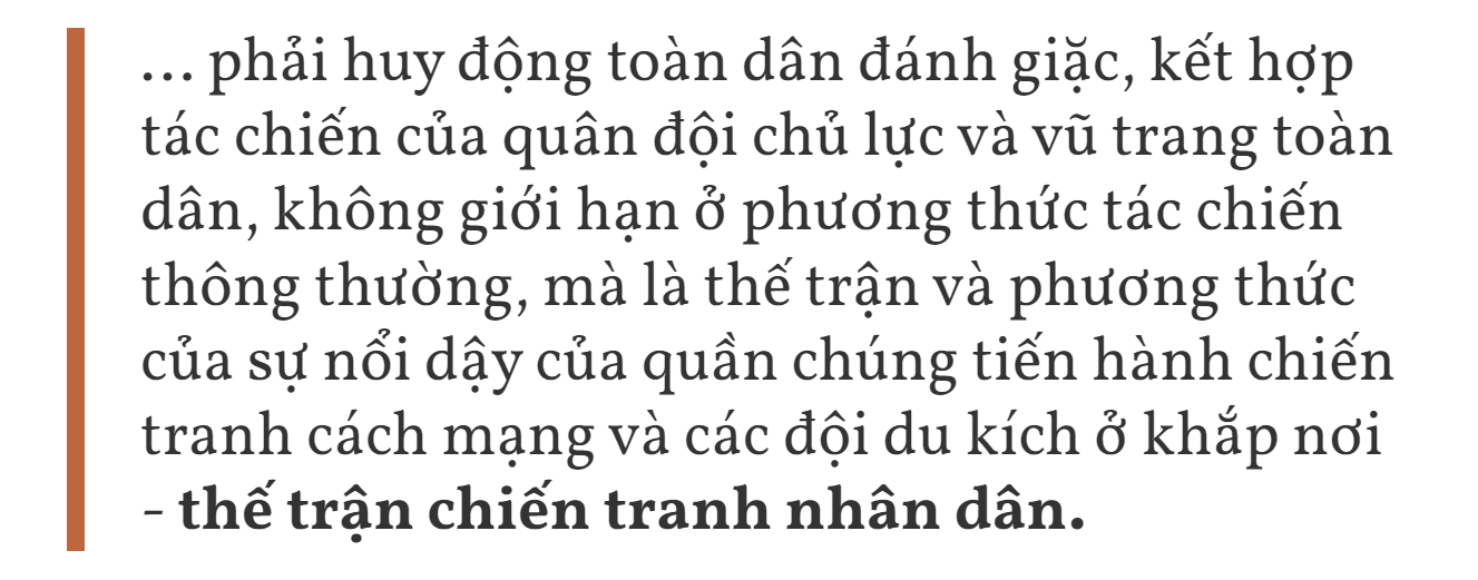 Lịch sử dân tộc đã chứng minh: muốn chống lại một đội quân xâm lược lớn mạnh hơn về lực lượng và phương tiện chiến tranh thì không thể chỉ trông cậy vào đội quân thường trực mà phải huy động toàn dân đánh giặc, kết hợp tác chiến của quân đội chủ lực và vũ trang toàn dân, không giới hạn ở phương thức tác chiến thông thường, mà là thế trận và phương thức của sự nổi dậy của quần chúng tiến hành chiến tranh cách mạng và các đội du kích ở khắp nơi - thế trận chiến tranh nhân dân. Thông qua thực tiễn chiến đấu, ta đã kịp thời rút kinh nghiệm trong toàn quân, toàn dân, tiến hành chỉnh huấn đôn quân, nâng cao bản chất giai cấp của quân đội nhân dân cách mạng, chính qui, hoàn chỉnh tổ chức biên chế, trang bị. Từng bước hình thành phương thức tác chiến tiến công các cứ điểm, cụm cứ điểm phòng ngự trong công sự vững chắc, nâng cao khả năng phối hợp giữa các lực lượng trong tác chiến, giữa tác chiến của các đại đoàn chủ lực cơ động với lực lượng vũ trang địa phương, dân quân du kích, lập thế trận chiến tranh nhân dân trên phạm vi cả nước và trên toàn chiến trường Đông Dương, làm cho địch dần mất thế chủ động. Đó là nghệ thuật tổ chức, chỉ đạo lực lượng vũ trang 3 thứ quân và nghệ thuật tổ chức và động viên nhân dân tham gia kháng chiến kiến quốc bằng mọi thứ vũ khí có trong tay, phối hợp chặt chẽ với các lực lượng vũ trang, phát huy sức mạnh vật chất và tinh thần đánh thắng địch.