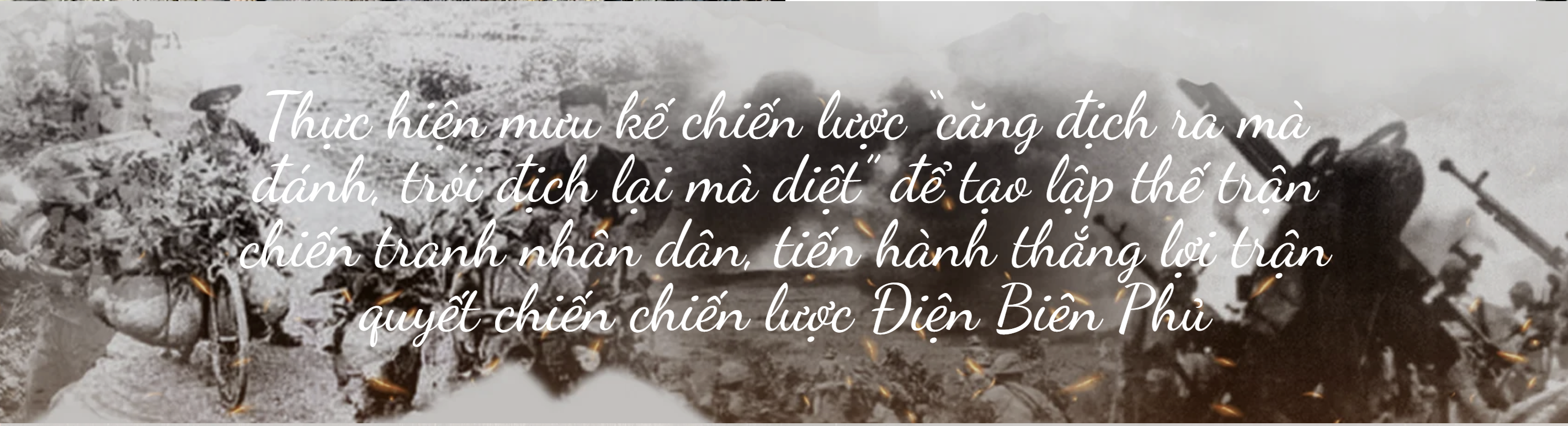 Thế trận chiến tranh nhân dân là tổng thể các biện pháp tổ chức, bố trí, triển khai lực lượng và thiết bị chiến trường nhằm tạo thế có lợi và phát huy cao nhất sức mạnh chiến đấu của các lực lượng tham chiến để giành thắng lợi trong tác chiến. Thế trận chiến tranh nhân dân được Bộ Tổng Tư lệnh chủ động hoạch định sớm, tổ chức tiến hành bằng nhiều biện pháp sáng tạo, phù hợp với từng chiến trường, từng giai đoạn. Đặc biệt, thế trận chiến tranh nhân dân ta đã được cụ thể hóa bằng việc thực hiện tốt mưu kế chiến lược “căng địch ra mà đánh - trói địch lại mà diệt,… thế trận như một trận đồ bát quái, đánh địch cả ở đằng trước mặt và đằng sau địch, đánh địch ở các chiều, các hướng”5. Sa vào thế trận đó, các đội quân xâm lược buộc phải phân tán lực lượng với tỷ lệ ngày càng cao, khiến cho chúng đông mà hóa ít, mạnh hóa yếu, không phát huy được ưu thế vũ khí, càng đánh càng bộc lộ sơ hở, càng đánh càng bị dồn vào thế bất lợi. Dựa trên nền thế trận chiến tranh nhân dân tạo ra, tích cực tạo lập thế trận chiến tranh nhân dân cho trận quyết chiến chiến lược Điện Biên Phủ. Căn cứ vào so sánh thế và lực giữa ta và địch cũng như yêu cầu của nhiệm vụ chiến lược, lợi dụng triệt để yếu tố địa hình, những đặc điểm ảnh hưởng cơ bản ở các chiến trường chính và phối hợp, ta đã bố trí, triển khai các lực lượng và thiết bị chiến trường một cách thích hợp nhất để thực hành thắng lợi trận then chốt, then chốt quyết định, hoàn thành toàn bộ nhiệm vụ trận quyết chiến chiến lược.