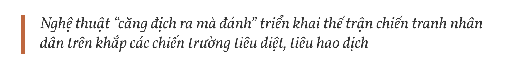 Bằng nghệ thuật tổ chức lực lượng cả nước đánh giặc, sử dụng hai hình thức đấu tranh cơ bản (đấu tranh quân sự kết hợp đấu tranh chính trị), hai phương thức tác chiến chủ yếu (tác chiến tập trung và tác chiến du kích), ta đã xây dựng được thế trận chiến tranh nhân dân tạo ra “thiên la địa võng” đối với quân thù. Thế trận chiến lược đó cho phép chúng ta thực hiện phối hợp tác chiến giữa lực lượng tại chỗ với lực lượng cơ động của bộ đội chủ lực; kết hợp đánh du kích với tập trung, kết hợp đánh nhỏ, đánh vừa, với đánh lớn. Thế trận chiến lược đó cho phép chúng ta có thể mở cuộc tiến công chiến lược ở bất cứ nơi nào có địch, đánh cả trước mặt, sau lưng, trong lòng địch; căng địch ra mà đánh, đánh mọi lúc, mọi nơi. Thế trận đó được giữ vững và ngày càng phát triển bởi hệ thống căn cứ địa, làng xã chiến đấu mọc lên khắp nơi, tạo thành thế bao vây, áp sát quân thù; đồng thời là chỗ đứng chân, là bàn đạp tiến công vững chắc của các lực lượng, bảo đảm cho quân và dân ta luôn đánh địch ở thế chủ động, càng đánh càng mạnh. Đó là nghệ thuật tổ chức thế trận chiến tranh nhân dân có tính khoa học, thống nhất và chặt chẽ cao, làm cho toàn dân ta triệu người như một, tạo thành lực lượng to lớn có một sức mạnh vô song để đánh địch và thắng địch.