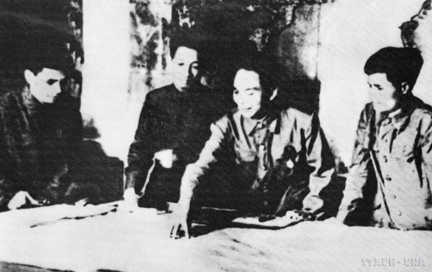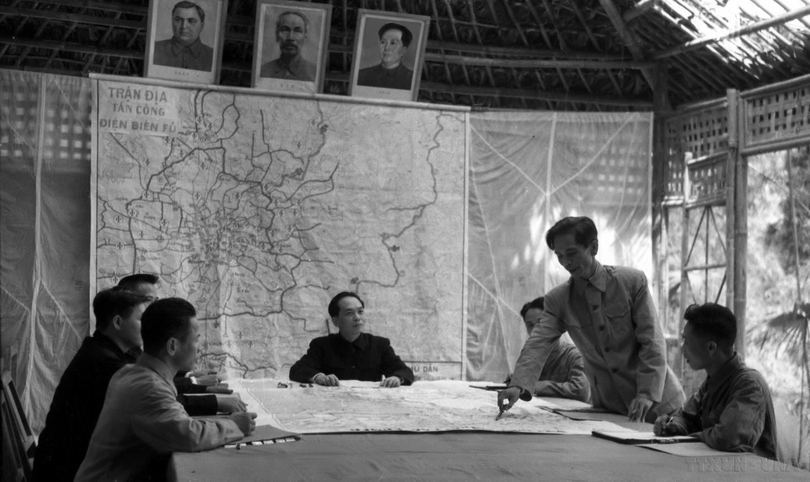 Bộ chỉ huy chiến dịch dưới sự chỉ đạo trực tiếp của Đại tướng Võ Nguyên Giáp đang bàn kế hoạch tác chiến cho từng trận đánh. (Ảnh: TTXVN)