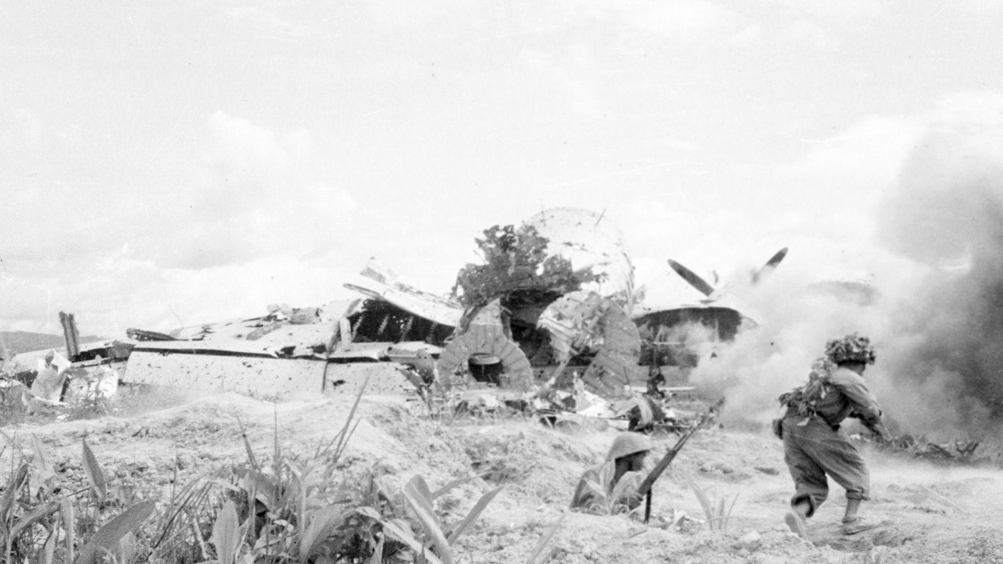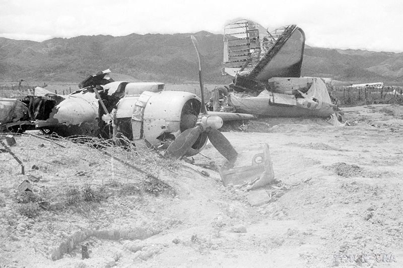 Xác máy bay bị quân ta bắn rơi và phá hủy nằm ngổn ngang trên chiến trường Điện Biên Phủ. Ảnh: TTXVN