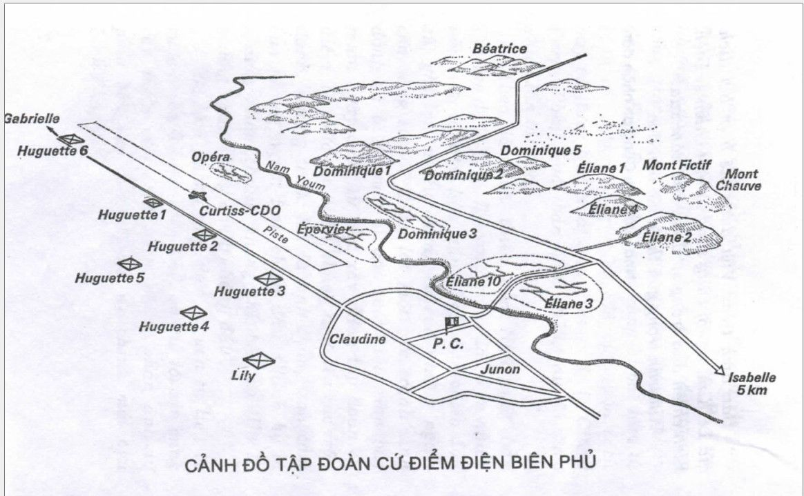 Cảnh đồ tập đoàn cứ điểm Điện Biên Phủ. Nguồn: Erwan Bergot, Điện Biên Phủ 170 ngày đêm bị vây hãm, người dịch: Lê Kim, Nxb CAND và Công ty văn hóa Phương Nam phối hợp thực hiện, Hà Nội, 2003