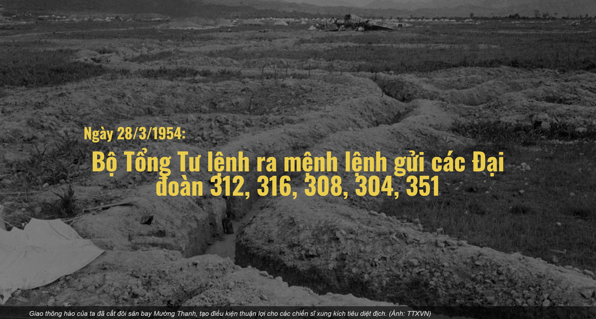 - Đại đoàn 316 (thiếu một trung đoàn): Tiêu diệt các cứ điểm 301 (A1), 302 (C1), 304 (C2), phối hợp với đơn vị bạn tiêu diệt tiểu đoàn dù thuộc địa số 6 hoặc bộ phận tiểu đoàn dù Việt Nam số 5. Sau khi diệt địch, để lại bộ phận lực lượng cải tạo công sự, ngăn địch phản kích chiếm lại, đồng thời tổ chức trận địa hỏa lực khống chế và sát thương quân địch ở Mường Thanh.
