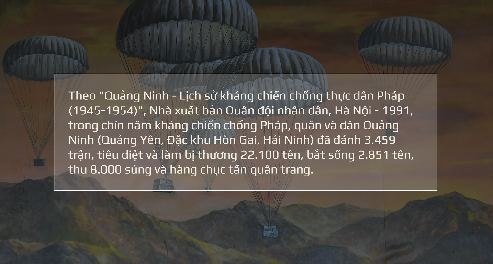Theo Quảng Ninh - Lịch sử kháng chiến chống thực dân Pháp (1945-1954), Nhà xuất bản Quân đội nhân dân, Hà Nội - 1991, trong chín năm kháng chiến chống Pháp, quân và dân Quảng Ninh (Quảng Yên, Đặc khu Hòn Gai, Hải Ninh) đã đánh 3.459 trận, tiêu diệt và làm bị thương 22.100 tên, bắt sống 2.851 tên, thu 8.000 súng và hàng chục tấn quân trang.