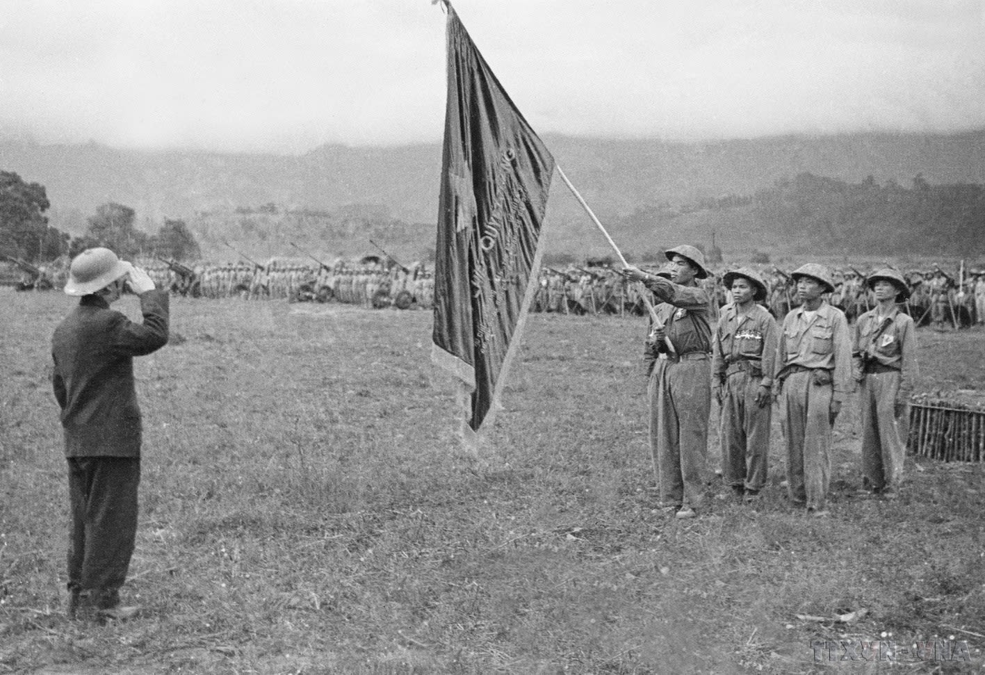 Đại tướng Võ Nguyên Giáp trao cờ Quyết chiến quyết thắng của Hồ Chủ Tịch tặng các đơn vị lập công.