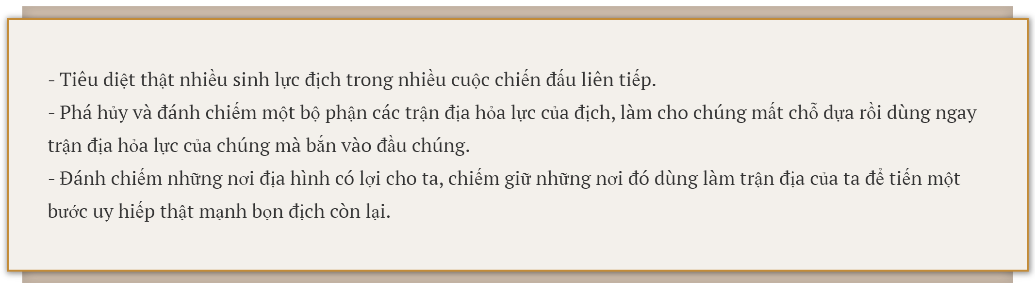 - Các cấp chỉ huy phải đề cao quyết tâm chiến đấu, kiên quyết, dũng mãnh, không để mất thời cơ diệt địch. Phải tự mình ra mặt trận, kiểm tra đôn đốc, tổ chức chiến đấu, động viên bộ đội.