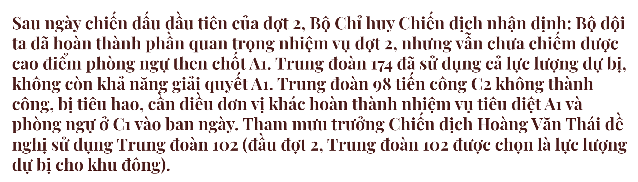 Sau 5 ngày chiến đấu của Đợt 2, ta đã thu được thắng lợi quan trọng. Ở phía đông, ta đã chiếm được 4 ngọn đồi hiểm yếu, nhưng địch vẫn giữ được điểm cao A1. Ở phía Tây, ta chiếm thêm được các điểm cao 106, 311.