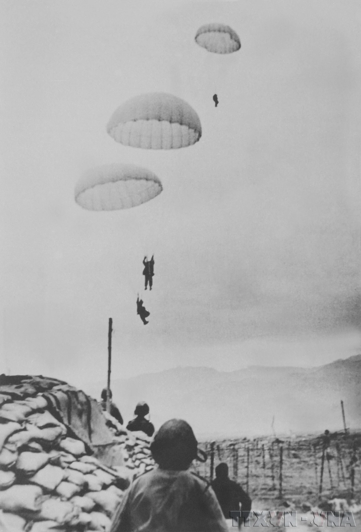 Cảnh lính Pháp nhảy dù xuống Điện Biên Phủ ngày 23/3/1954. Ảnh: TTXVN