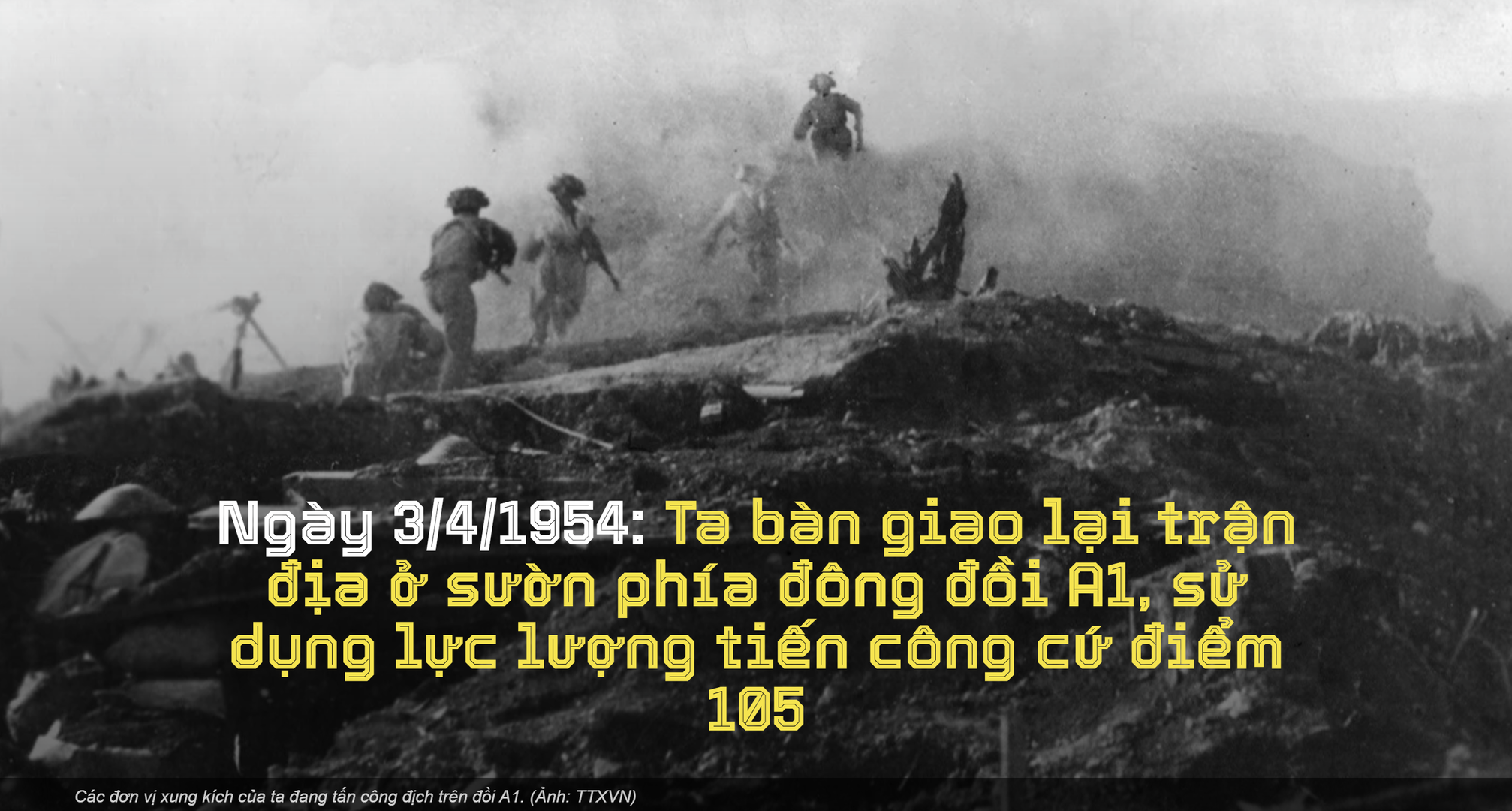 4 giờ 30 phút ngày 3/4/1954, Trung đoàn 102 (Đại đoàn 308) được lệnh bàn giao lại trận địa ở sườn phía đông A1 cho Trung đoàn 174 (Đại đoàn 316), về tập kết tại rừng Mường Phăng để củng cố lực lượng.