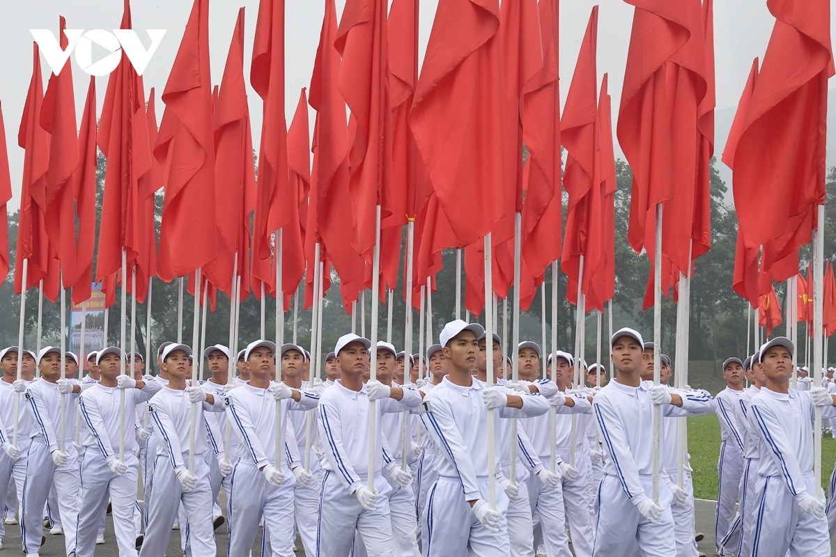 Khối cờ Đảng, Cờ Tổ quốc, cùng khối quân kỳ dẫn đầu đội hình các khối đại điện cho lực lượng vũ trang tiến vào lễ đài.