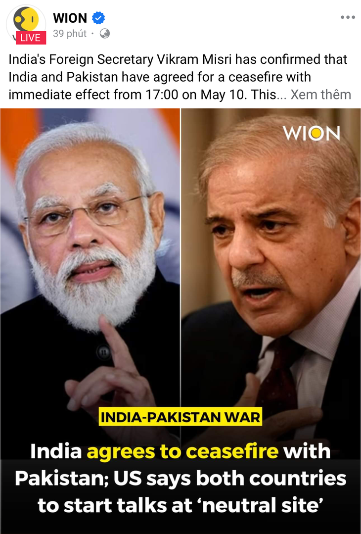 "Tôi vui mừng thông báo rằng Ấn Độ và Pakistan đã đồng ý ngừng bắn hoàn toàn và ngay lập tức", Trump viết trong bài đăng trên Truth Social vào thứ Bảy. Ông cũng ca ngợi cả hai bên đã thể hiện "lý lẽ thường tình và trí thông minh tuyệt vời".