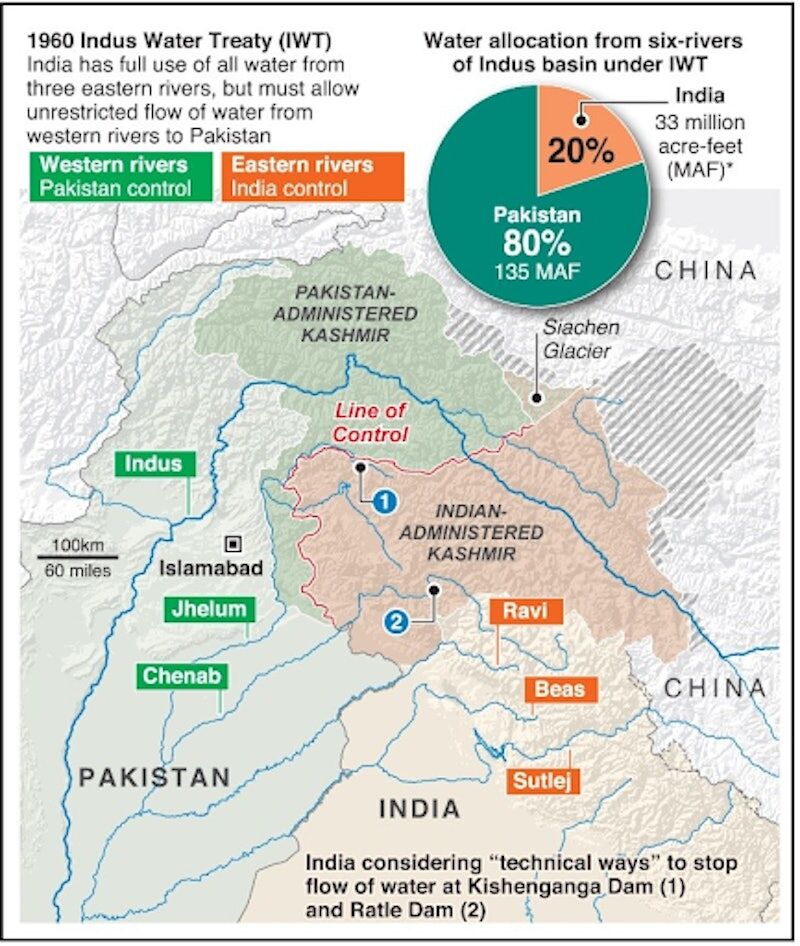 Vì 80% lượng nước tưới tiêu của Pakistan đến từ lưu vực sông Indus và nông nghiệp chiếm khoảng một phần tư GDP của đất nước, Pakistan đã từng cảnh báo rằng việc cắt nguồn cung cấp nước sẽ là một hành động chiến tranh. Tuy nhiên, do khả năng chứa nước hạn chế của các đập ở Ấn Độ nên thực tế không có cách nào có thể cắt nguồn cung cấp nước cho Pakistan trong thời gian ngắn. Tác động tức thời của việc đình chỉ thỏa thuận về nước sông có thể là việc đình chỉ chia sẻ dữ liệu về mực nước sông, cảnh báo lũ lụt, v.v. Tất nhiên, điều này có thể ảnh hưởng đến công tác quản lý lũ lụt và quy hoạch nông nghiệp ở Pakistan. Pakistan tuyên bố rằng nếu Ấn Độ cắt nguồn cung cấp nước hoặc chuyển hướng dòng nước thì đó sẽ là hành động chiến tranh. Để đáp trả việc Ấn Độ đình chỉ thỏa thuận về nước sông, Pakistan tuyên bố sẽ đình chỉ việc tham gia Hiệp định Simla được ký kết năm 1972. Thỏa thuận này luôn là nền tảng để Ấn Độ và Pakistan duy trì hòa bình biên giới và tránh chiến tranh toàn diện. Thỏa thuận quy định rằng hai bên phải giải quyết tranh chấp một cách hòa bình và cam kết duy trì nguyên trạng của Đường kiểm soát thực tế (LoC). Sau khi thỏa thuận về nước sông bị đình chỉ, một số dư luận Pakistan tin rằng mục tiêu của Modi đã đạt được. Modi đã nói rõ sau vụ tấn công khủng bố năm 2016 rằng "máu và nước không thể chảy cùng nhau". Sau các cuộc tấn công khủng bố năm 2019, chính quyền Modi đã giành lại khu tự trị Kashmir, cho phép người ngoài sở hữu đất đai ở Kashmir và tạo điều kiện thuận lợi hơn cho việc xây dựng cơ sở hạ tầng mới, đặc biệt là các con đập sẽ ảnh hưởng đến dòng chảy hạ lưu. Từ năm 2023 đến năm 2024, Ấn Độ đã nêu ra "những thay đổi cơ bản về hoàn cảnh" là lý do muốn khởi động lại các cuộc đàm phán về thỏa thuận về nguồn nước sông. Các nhà phân tích tin rằng vụ tấn công khủng bố ngày 22/04 chính là cái cớ để Modi rút khỏi thỏa thuận về nước sông để có thể thiết lập lợi thế chiến lược về nguồn nước so với Pakistan và do đó mục tiêu địa chính trị của ông đã đạt được.