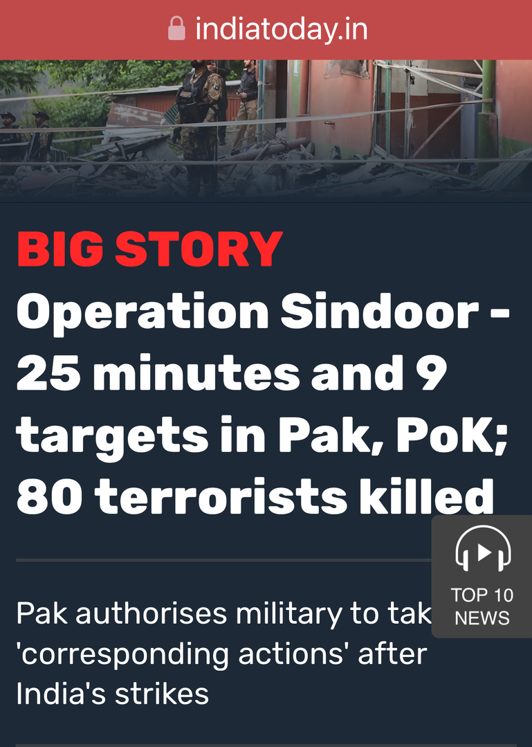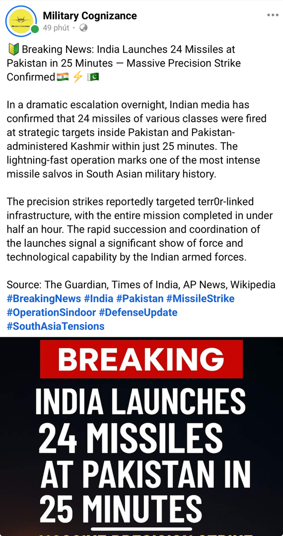 Rạng sáng ngày 7 tháng 5, Ấn Độ đã phóng tên lửa vào chín mục tiêu ở Pakistan để đáp trả vụ tấn công khủng bố ngày 22/04 khiến 26 người thiệt mạng ở vùng Kashmir do Ấn Độ quản lý. Chiến dịch quân sự này có mật danh là "Chiến dịch Sindoor", nhằm vào các mục tiêu được coi là "cơ sở hạ tầng khủng bố" ở Pakistan và vùng Kashmir do Pakistan quản lý, bao gồm Muzaffarabad và Kotli ở vùng Kashmir do Pakistan quản lý và Bahawalpur và Muridke ở tỉnh Punjab. Phía Pakistan ngay lập tức thừa nhận có 6 địa điểm bị tấn công, ít nhất 8 người thiệt mạng và 38 người bị thương. Thủ tướng Pakistan Shehbaz Sharif gọi cuộc tấn công của Ấn Độ là một "hành động chiến tranh" và phát biểu trên X rằng "một phản ứng mạnh mẽ đang được đưa ra". Ngay lập tức, quân đội Pakistan tuyên bố đã bắn hạ 2 máy bay quân sự và 1 máy bay không người lái của Ấn Độ, nhưng phía Ấn Độ không xác nhận thông tin này. Sau khi tiến hành cuộc tấn công, chính quyền Ấn Độ nhấn mạnh rằng hành động này "có trọng tâm, kiềm chế và không leo thang", không nhắm vào các cơ sở quân sự của Pakistan và cho thấy "sự kiềm chế cao" trong việc lựa chọn mục tiêu và cách thực hiện. Nhưng với phản ứng nhanh chóng của Pakistan, liệu hai quốc gia sở hữu vũ khí hạt nhân này có thể dừng lại ở đó không?