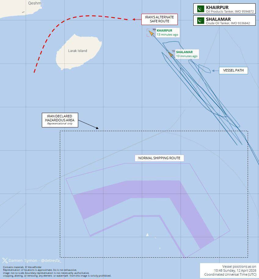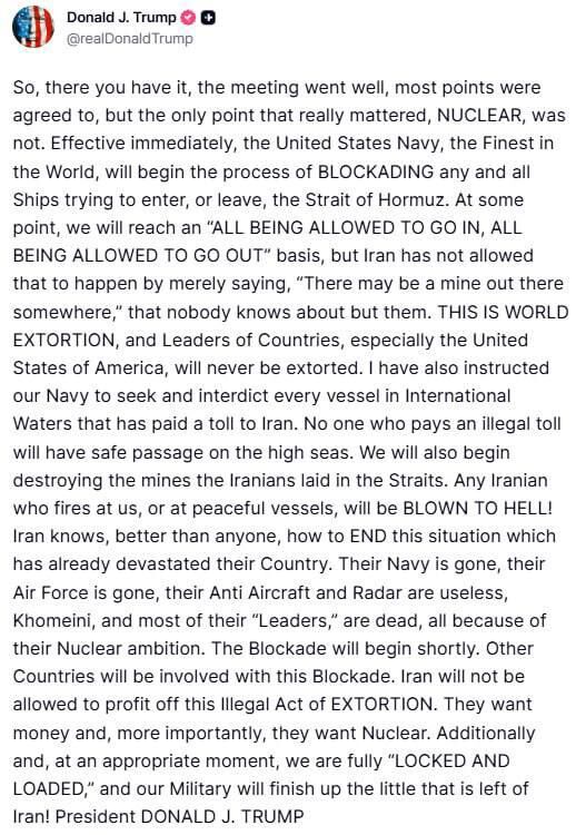 "Tôi đã chỉ thị Hải quân của chúng ta xác định và chặn bắt mọi tàu thuyền trong vùng biển quốc tế đã trả phí cho Iran. Không ai trả phí bất hợp pháp sẽ được an toàn trên biển cả. Chúng ta cũng sẽ bắt đầu phá hủy các quả thủy lôi mà Iran đã đặt trong eo biển. Bất kỳ người Iran nào bắn vào chúng ta hoặc vào các tàu dân sự sẽ bị TIÊU DIỆT!" Tổng thống Mỹ viết. Việc phong tỏa sẽ sớm bắt đầu. Các quốc gia khác cũng sẽ tham gia vào cuộc phong tỏa này.