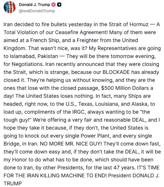 "Chúng tôi đang đề nghị một thỏa thuận rất công bằng và hợp lý, và tôi hy vọng họ chấp nhận nó, bởi vì nếu họ không chấp nhận, Hoa Kỳ sẽ phá hủy mọi nhà máy điện hạt nhân và mọi cây cầu ở Iran," Tổng thống Mỹ viết.