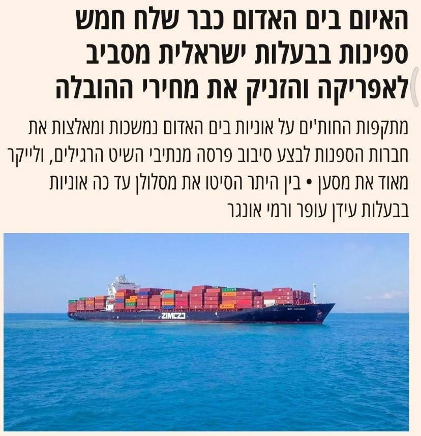 Unionist Media: Mối đe dọa của Yemen ở Biển Đỏ cho đến nay đã buộc 5 tàu Israel phải đi vòng quanh châu Phi và làm tăng chi phí vận chuyển.