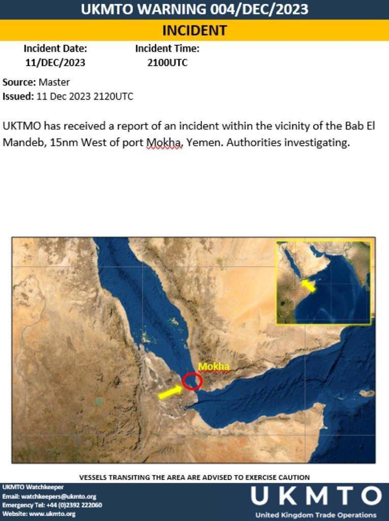 Cơ quan điều hành thương mại hàng hải Anh (UKMTO) diễn ra sau nửa đêm và có sự tham gia của một tàu chở dầu ngoài khơi Mokha đang vận chuyển một lô hàng dầu khẩn cấp đến một cảng của Israel.