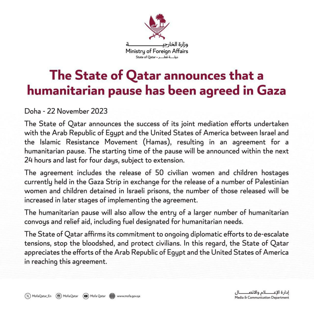 Qatar, với tư cách là trung gian hòa giải, đã tuyên bố tạm dừng nhân đạo 4 ngày ở Dải Gaza. Bộ Ngoại giao Qatar đưa ra tuyên bố về thỏa thuận giữa Hamas và Israel: