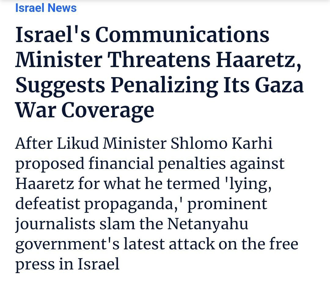 ◾️Bộ trưởng Truyền thông Israel Shlomo Karhi đã đệ trình đề xuất hành động chống lại Haaretz bằng cách chấm dứt việc công bố các thông báo của chính phủ tại Haaretz. Karhi, một thành viên đảng Likud của Thủ tướng Benjamin Netanyahu, cho biết tờ báo này đã "phá hoại Israel trong thời chiến" và là "cơ quan ngôn luận gây kích động cho kẻ thù của Israel".