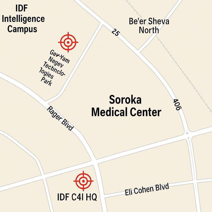 Đài truyền hình Al-Mayadeen, trích dẫn nguồn tin từ dịch vụ xe cứu thương Magen David Adom của Israel, đưa tin rằng cuộc không kích vào buổi sáng của Iran đã tấn công vào một phòng thí nghiệm nghiên cứu sinh học gần bệnh viện Soroka, nơi được coi là một cơ sở nhạy cảm về mặt an ninh quốc gia.