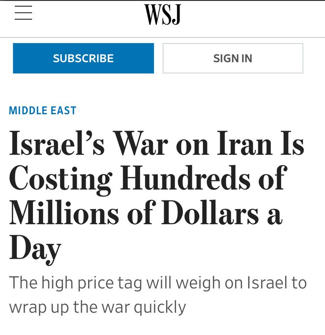 Cái giá của Israel cho cuộc chiến đang BẮN qua mái nhà, HÀNG TRIỆU đô la một ngày — WSJ Các máy bay đánh chặn cần thiết để phá hủy tên lửa Iran đang bay tới là chi phí LỚN NHẤT — Hàng chục triệu đến 200 triệu đô la một ngày Việc tái thiết có thể khiến Israel mất ít nhất 400 triệu đô la