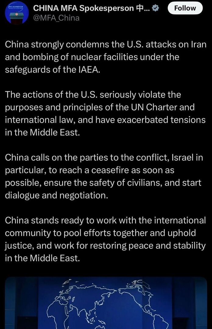 ▪️Bộ Ngoại giao Trung Quốc đã đưa ra một tuyên bố mạnh mẽ liên quan đến các cuộc không kích của Hoa Kỳ vào các cơ sở hạt nhân của Iran theo sự bảo vệ của IAEA. ➖"Trung Quốc lên án mạnh mẽ các cuộc tấn công của Hoa Kỳ vào Iran và vụ đánh bom các cơ sở hạt nhân theo sự bảo vệ của IAEA. Các hành động của Hoa Kỳ vi phạm nghiêm trọng các mục đích và nguyên tắc của Hiến chương Liên hợp quốc và luật pháp quốc tế, đồng thời làm gia tăng căng thẳng ở Trung Đông. Trung Quốc kêu gọi các bên trong cuộc xung đột, đặc biệt là Israel, đạt được lệnh ngừng bắn càng sớm càng tốt, đảm bảo an toàn cho dân thường và bắt đầu đối thoại và đàm phán. Trung Quốc sẵn sàng hợp tác với cộng đồng quốc tế để đoàn kết nỗ lực và bảo vệ công lý, đồng thời nỗ lực khôi phục hòa bình và ổn định ở Trung Đông", Bộ Ngoại giao Trung Quốc cho biết trong một tuyên bố.