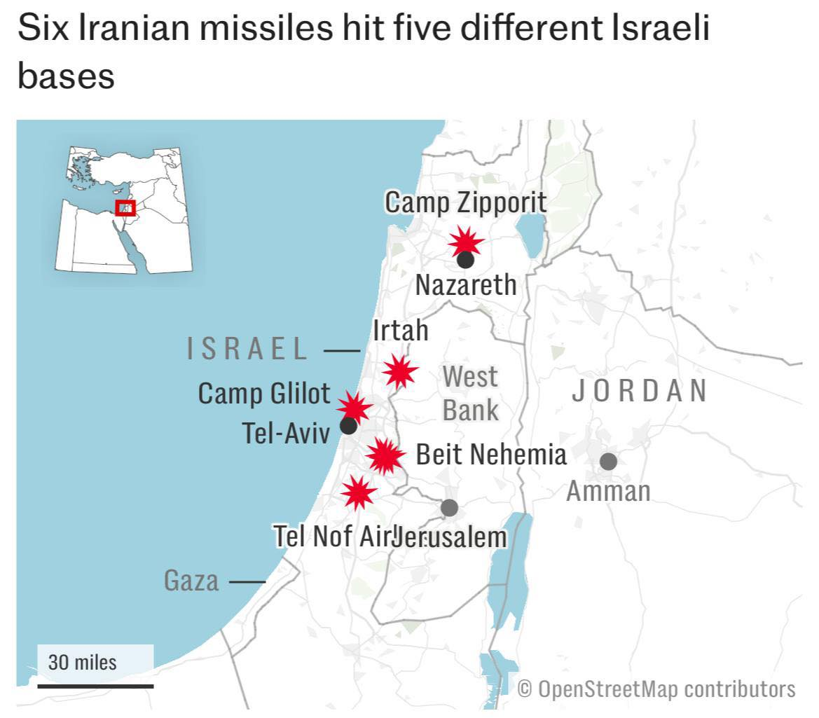 ▪️Hình ảnh vệ tinh cho thấy 6 tên lửa của Iran đã đánh trúng 5 mục tiêu ở phía bắc, phía nam và khu vực trung tâm Israel, bao gồm một trung tâm thu thập tình báo và một cơ sở hậu cần. Trong suốt cuộc chiến ngắn, Iran đã tấn công hơn 40 mục tiêu hạ tầng của Israel. Theo The Daily Telegraph, hệ thống phòng không của Israel và Mỹ đã đánh chặn khoảng 84% số tên lửa.