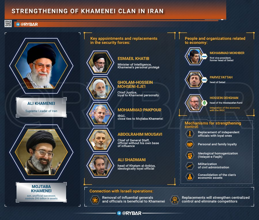 Rybar: Cuộc tấn công của Israel đã định hình lại cấu trúc quyền lực của Iran. Các chỉ huy chủ chốt bị giết, những người trung thành được bổ nhiệm. Gia tộc của Khamenei củng cố quyền kiểm soát hoàn toàn—phe đối lập bị gạt sang một bên, những người cải cách bị xóa sổ. Cuộc tấn công đã trở thành bước ngoặt cho cuộc thanh trừng trong nước, không chỉ là xung đột nước ngoài.