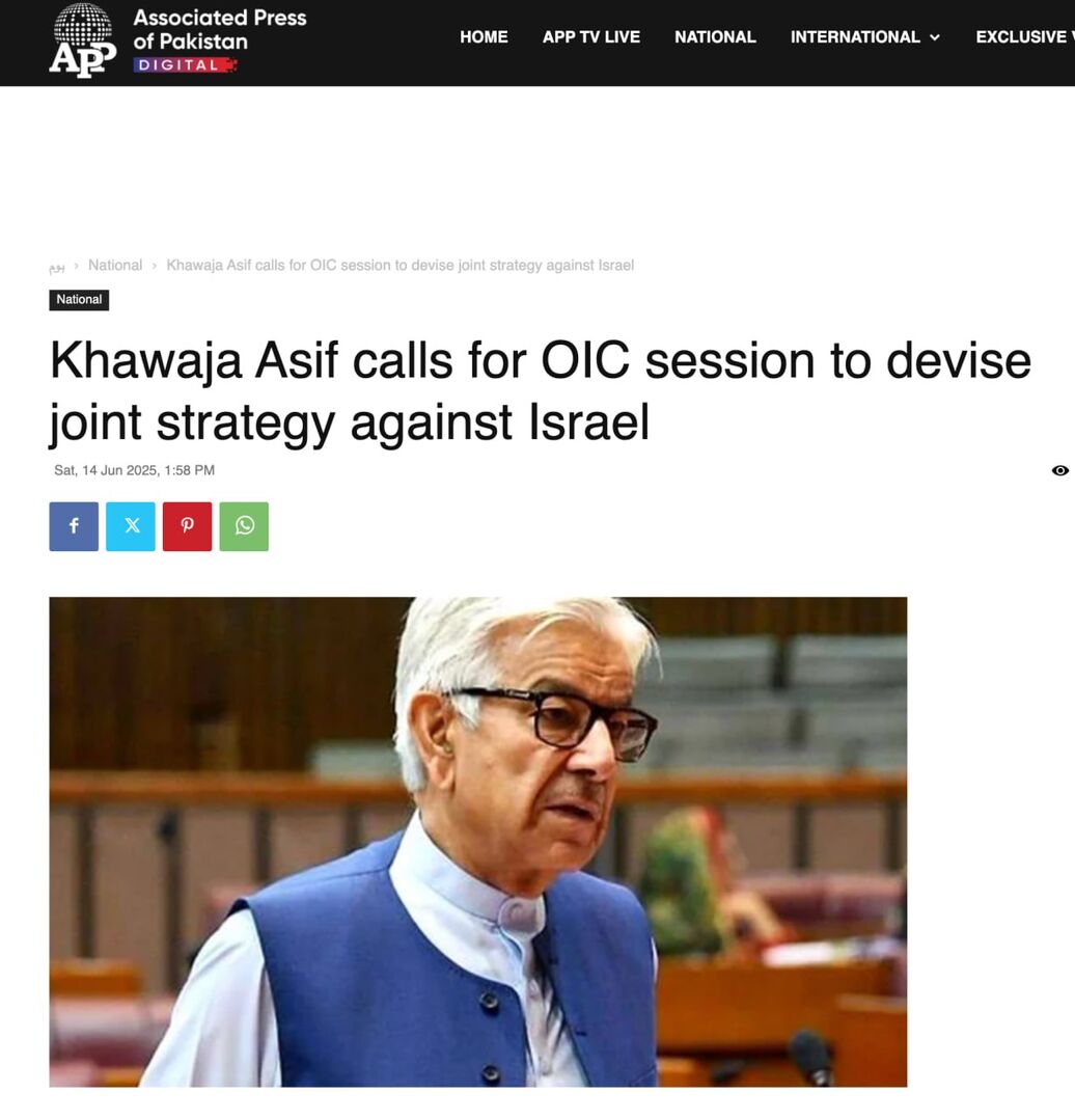 Bộ trưởng Quốc phòng Pakistan Khawaja Asif nói với hãng tin Associated Press ( https://www.app.com.pk/national/khawaja-asif-calls-for-oic-session-to-devise-joint-strategy-against-israel/) rằng nếu thế giới Hồi giáo không đoàn kết, họ sẽ phải chịu chung số phận như Iran.