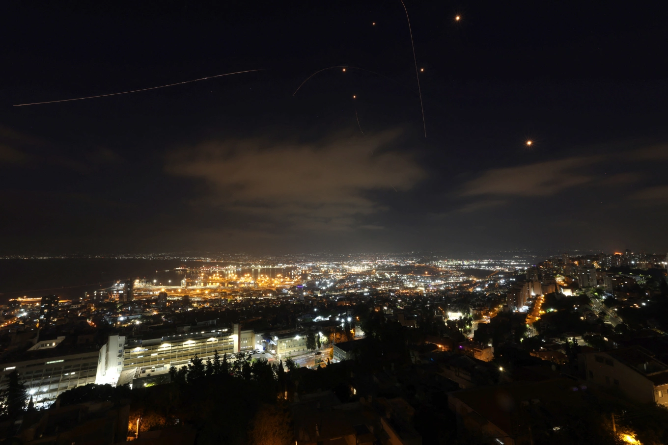 Hệ thống phòng không Israel đánh chặn tên lửa Iran trên bầu trời thành phố Haifa ngày 15/6. Ảnh:AFP