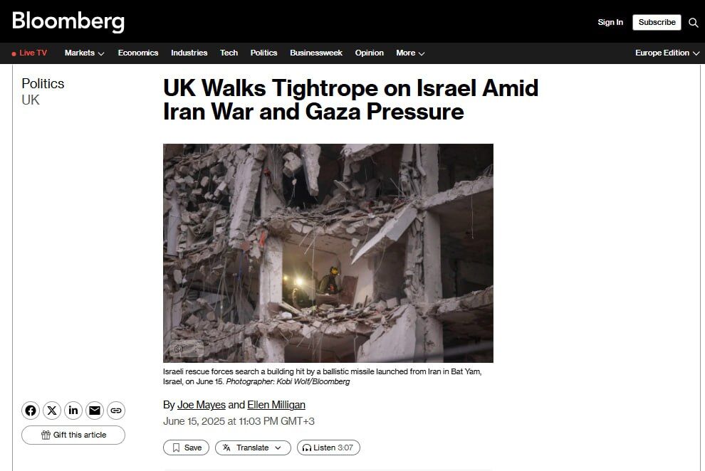 Chính phủ Anh đang cố gắng đi trên dây trong quan hệ với Israel, bày tỏ sự ủng hộ đối với hành động quân sự của nước này chống lại Iran trong khi chỉ trích cuộc chiến ở Gaza, Bloomberg viết ( https://www.bloomberg.com/news/articles/2025-06-15/uk-walks-tightrope-on-israel-amid-iran-war-and-gaza-pressure?srnd=homepage-europe).