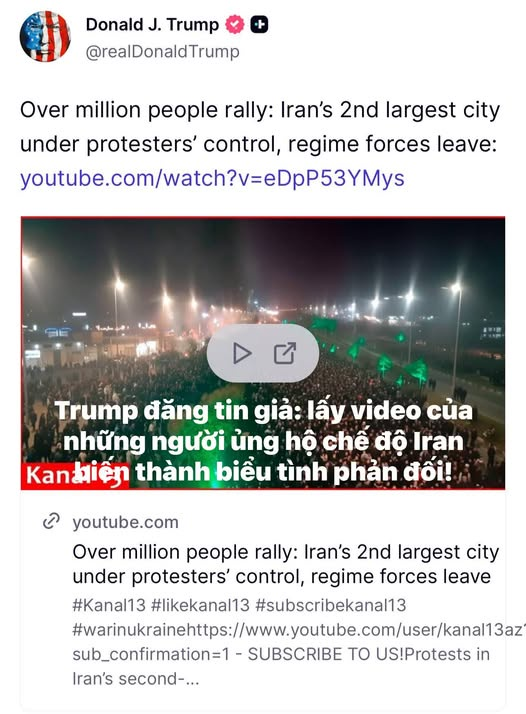 Trump đã chia sẻ một video fake trên YouTube với tuyên bố sai sự thật rằng “hơn một triệu người” đang biểu tình ở Mashhad, Iran. Ông này cũng đưa thông tin sai lệch rằng Mashhad đang nằm dưới “sự kiểm soát của những người biểu tình”. Trong khi sự thực Mashhal là thành trì tôn giáo của những người ủng hộ chế độ Cộng hoà Hồi giáo Iran, và hình ảnh là về sự biểu dương lực lượng của họ.