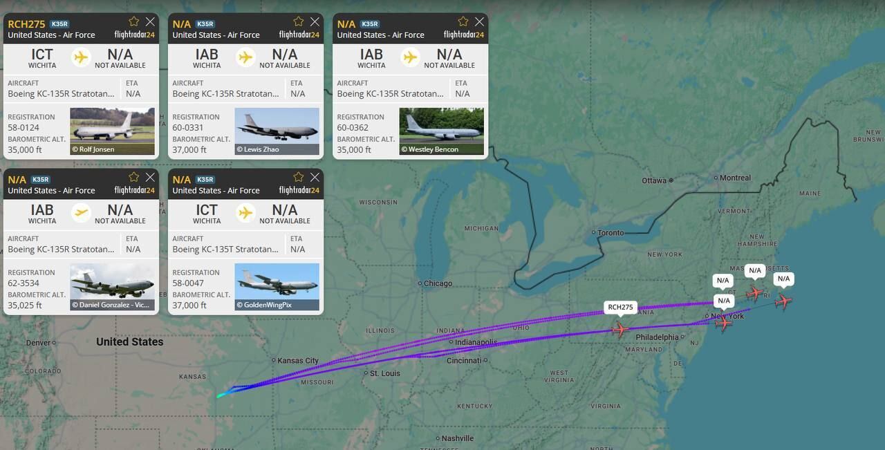 Không quân Hoa Kỳ tiếp tục tăng cường đội máy bay tiếp nhiên liệu trên không ở Trung Đông: năm máy bay tiếp nhiên liệu KC-135R/T đã cất cánh từ Căn cứ Không quân McConnell ở Wichita, Kansas, và đang hướng đến Căn cứ Không quân Moron ở Tây Ban Nha.