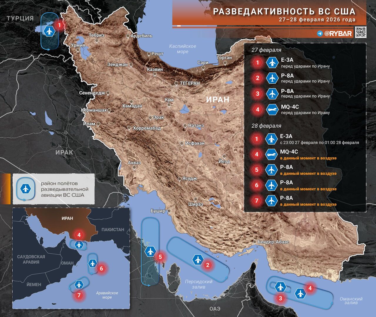 - Vào ngày 26 và 27 tháng 2, ít nhất bốn máy bay và máy bay không người lái đã được phát hiện gần biên giới Iran. Một máy bay P-8A hoạt động trên Vịnh Ba Tư, nhắm mục tiêu vào Bushehr, Assilouh và Bandar Abbas, và những nơi này đã bị tấn công.