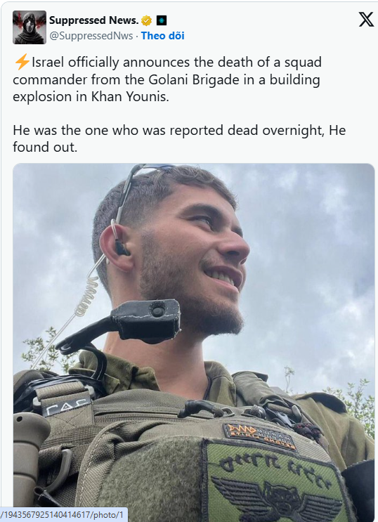 Israel chính thức thông báo một tiểu đội trưởng Lữ đoàn Golani đã thiệt mạng trong một vụ nổ tòa nhà ở Khan Younis.