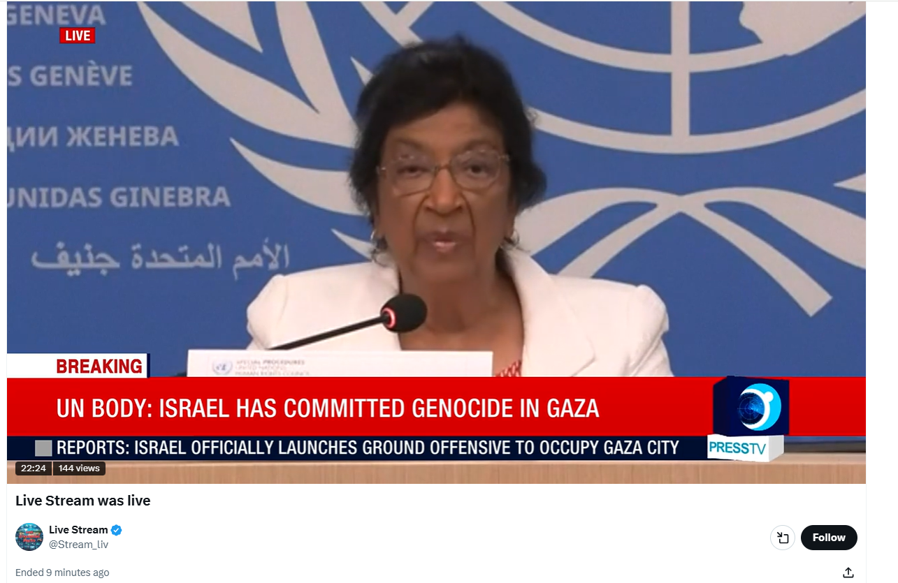 ENEVA, ngày 16 tháng 9 (Reuters) - Một Ủy ban Điều tra của Liên Hợp Quốc đã kết luận hôm thứ Ba rằng Israel đã phạm tội diệt chủng ở Gaza và các quan chức cấp cao của Israel, bao gồm cả Thủ tướng Benjamin Netanyahu, đã kích động những hành vi này.