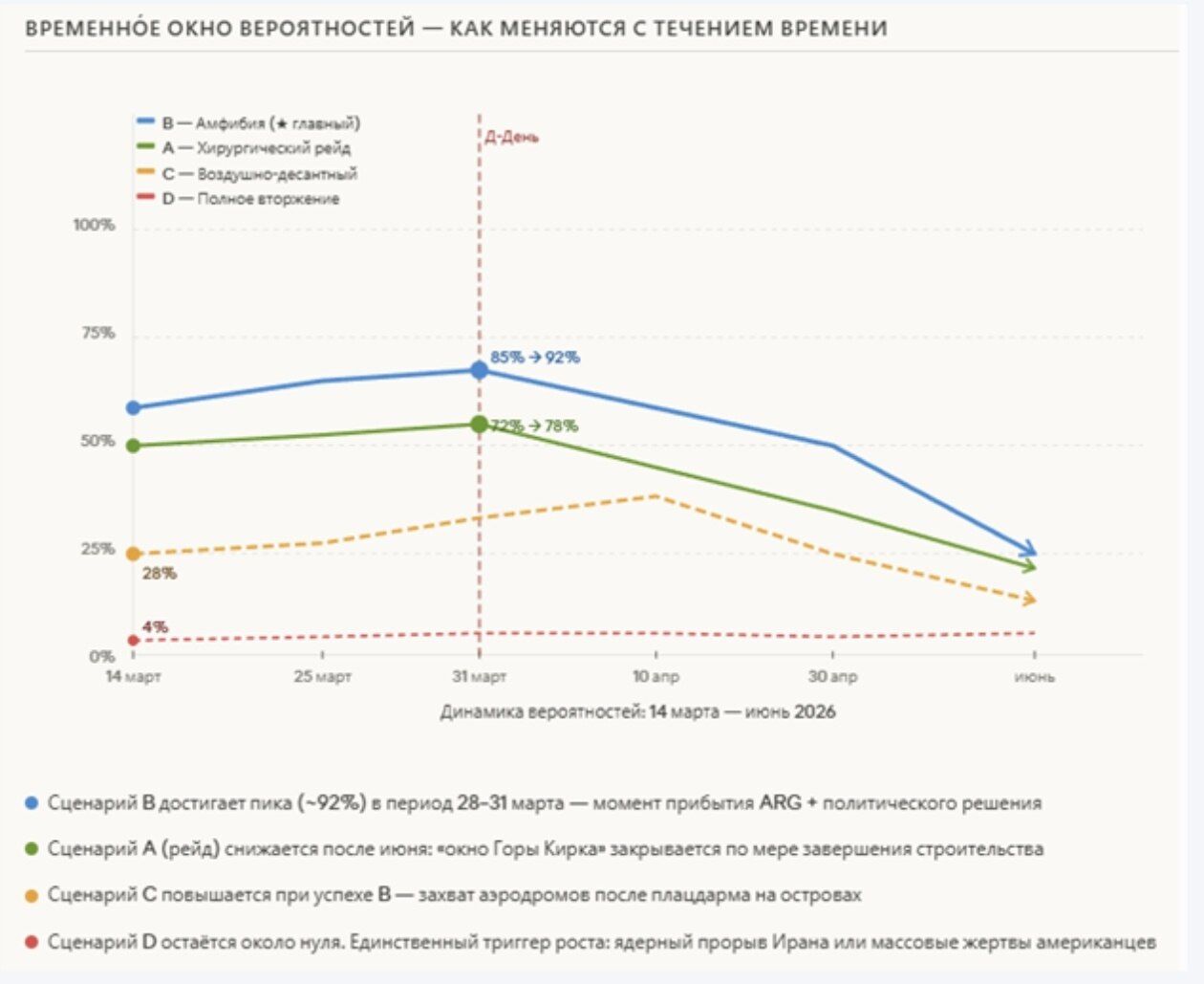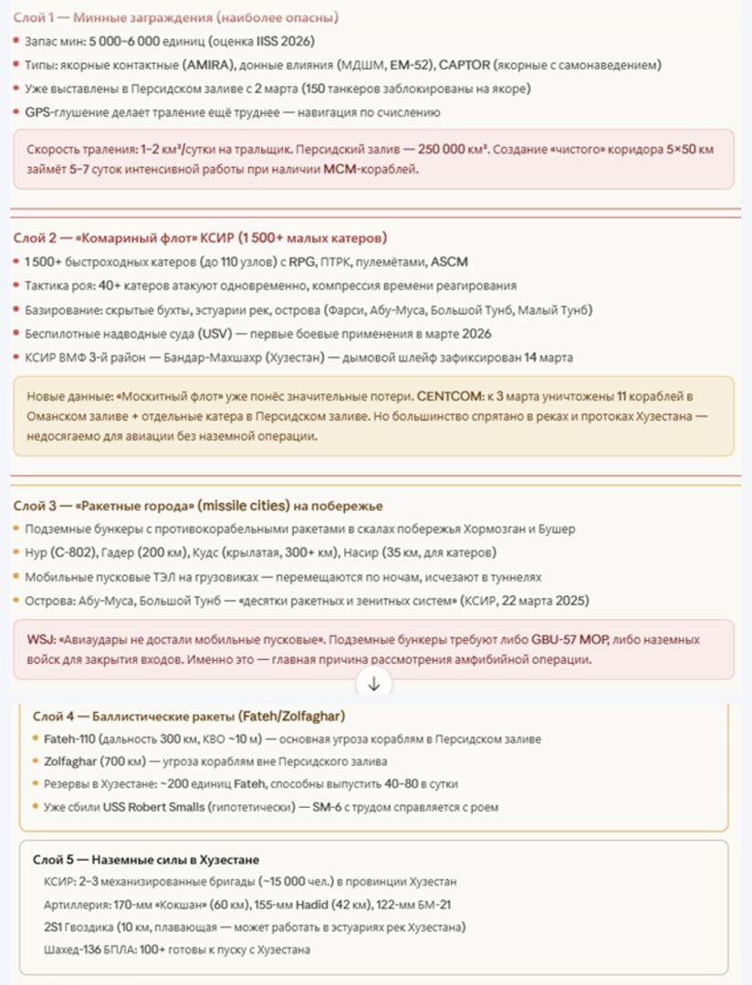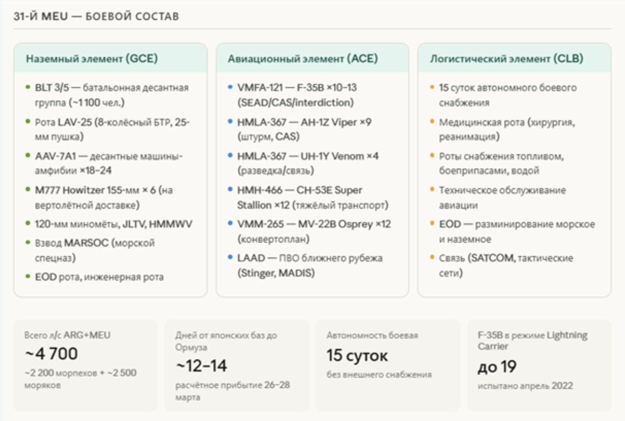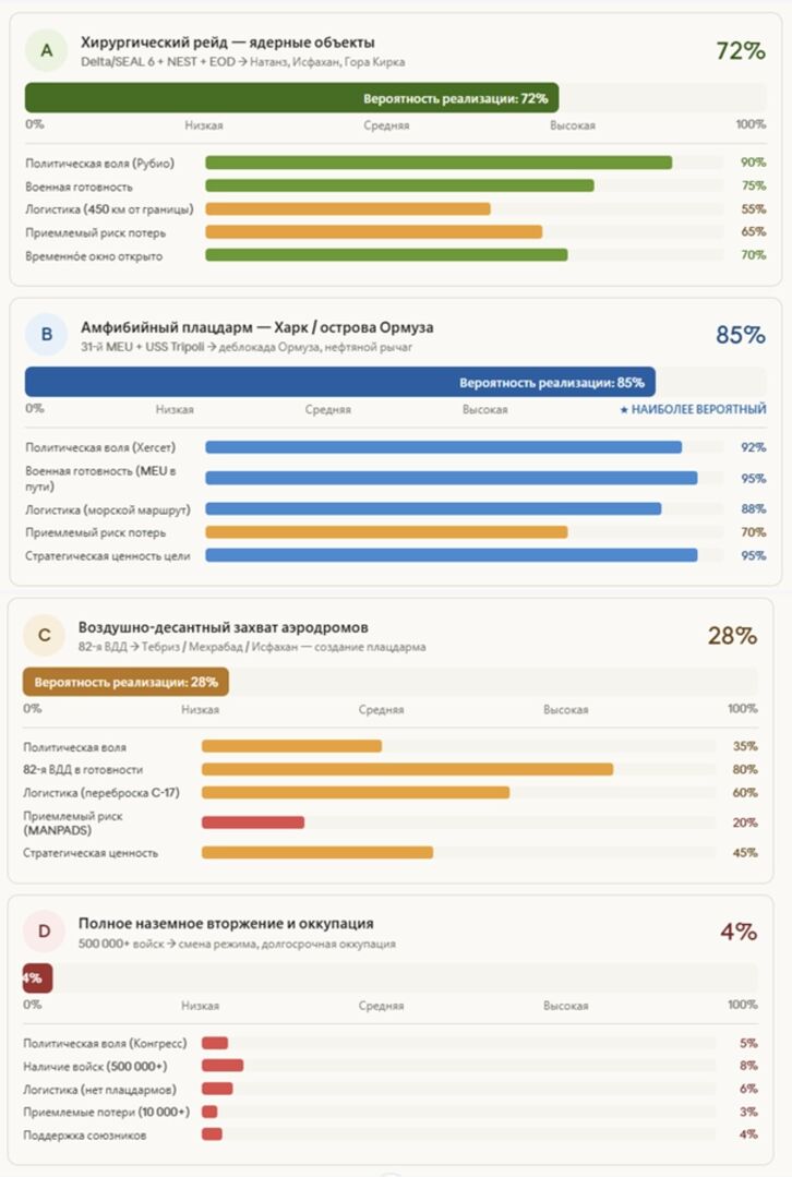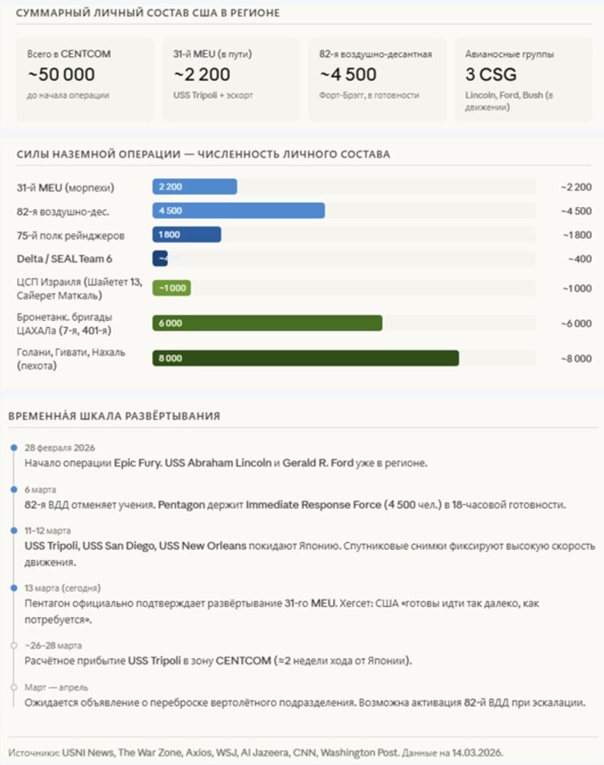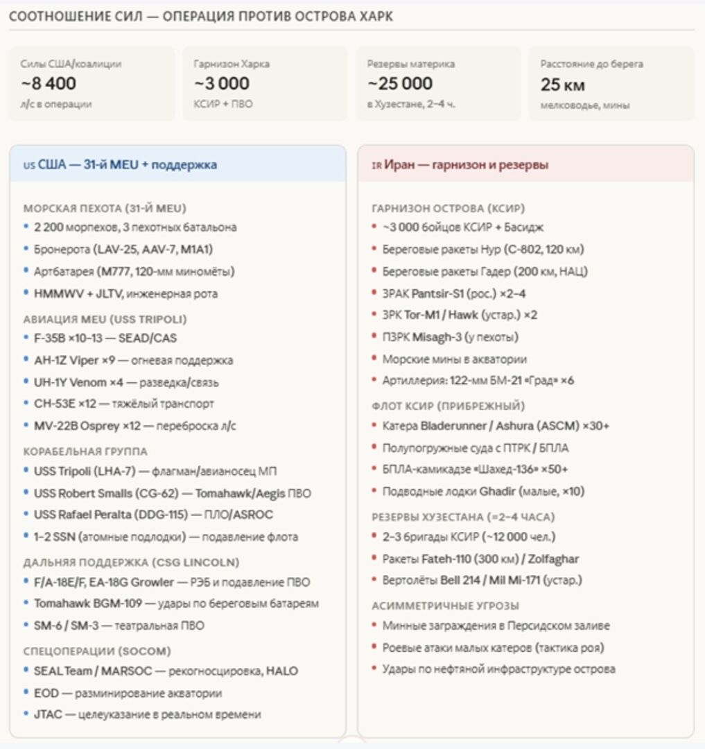 Đồ họa thông tin: tổng số nhân sự Mỹ trong khu vực, tiến trình triển khai, xác suất của các kịch bản chiến dịch đổ bộ, khung thời gian xác suất, cán cân lực lượng – chiến dịch chống lại đảo Kharg, thành phần của Nhóm Phòng không Tripoli và Lữ đoàn Viễn chinh số 31 (31st EMU), cấu trúc hệ thống phòng thủ của Iran, so sánh lực lượng và rủi ro.