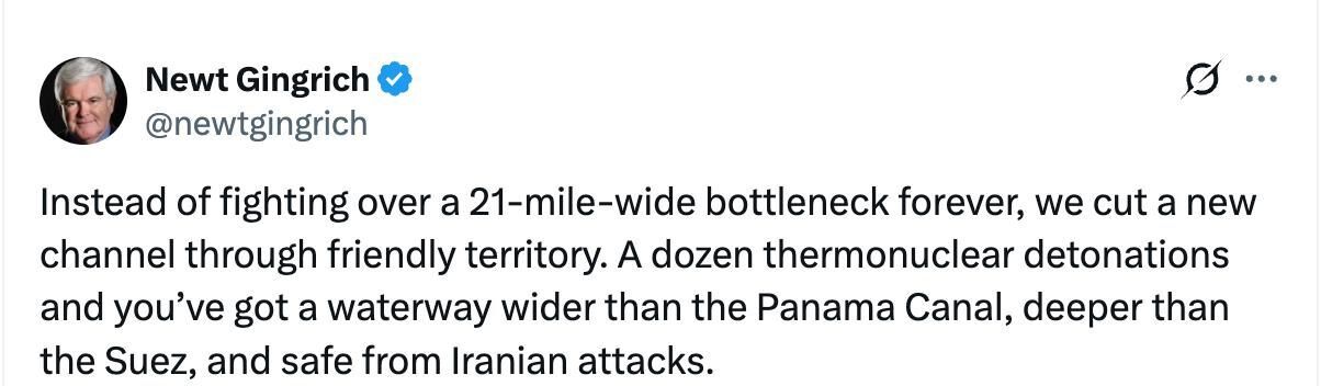 "Thay vì mãi mãi tranh giành một đoạn đường thủy hẹp dài 21 dặm, chúng ta sẽ đào một kênh đào mới xuyên qua lãnh thổ thân thiện. Hàng chục vụ nổ nhiệt hạch - và bạn sẽ có một tuyến đường thủy rộng hơn kênh đào Panama, sâu hơn kênh đào Suez, và an toàn khỏi các cuộc tấn công của Iran," Gingrich viết trên tờ The Hill.