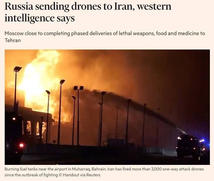 Theo các cơ quan tình báo phương Tây, Nga sắp hoàn tất việc chuyển giao máy bay không người lái, thiết bị y tế và lương thực cho Iran sau các cuộc đàm phán bí mật diễn ra sau các cuộc tấn công của Mỹ và Israel vào Tehran. Tờ Financial Times đưa tin đây có thể là trường hợp hỗ trợ đầu tiên được biết đến giữa Nga và Iran kể từ khi chiến tranh bắt đầu.