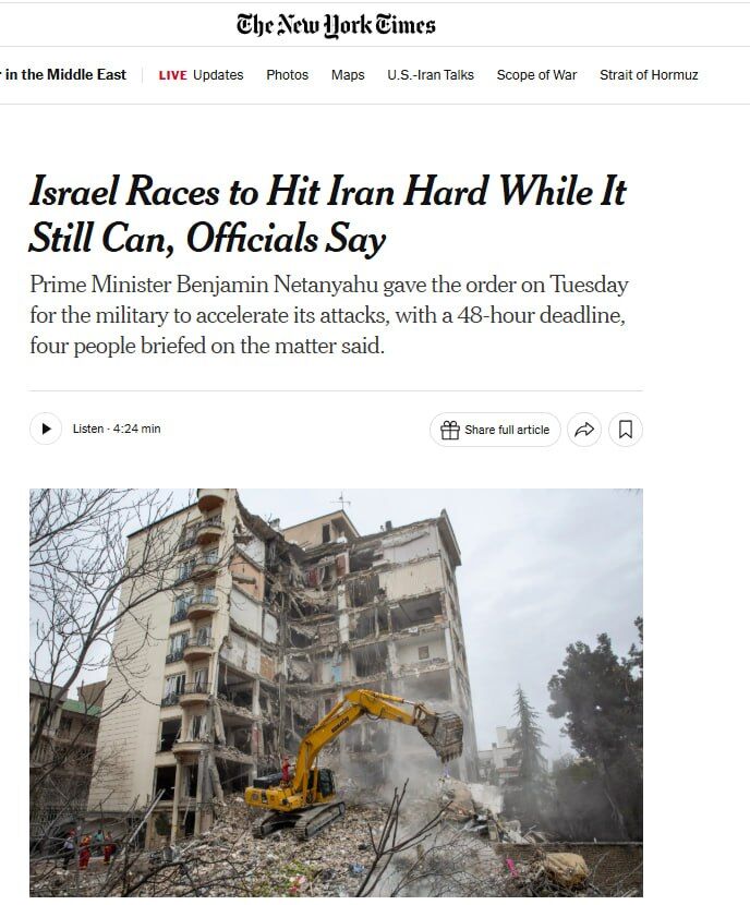 Sự gấp rút này xuất phát từ việc chính phủ Israel nhận được kế hoạch hòa bình 15 điểm của Mỹ. Tel Aviv lo ngại rằng Donald Trump có thể tuyên bố bắt đầu đàm phán với Iran bất cứ lúc nào, điều này sẽ làm gián đoạn chiến dịch quân sự mà Israel coi là của riêng mình.