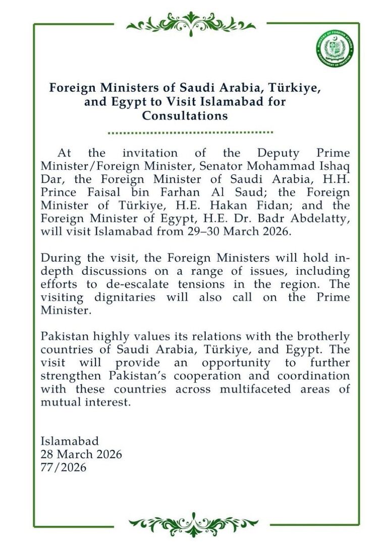 Các Ngoại trưởng Pakistan, Ả Rập Xê Út, Thổ Nhĩ Kỳ và Ai Cập sẽ gặp nhau tại Islamabad để thảo luận về đàm phán hòa bình nhằm giảm leo thang căng thẳng liên quan đến Iran và khu vực.