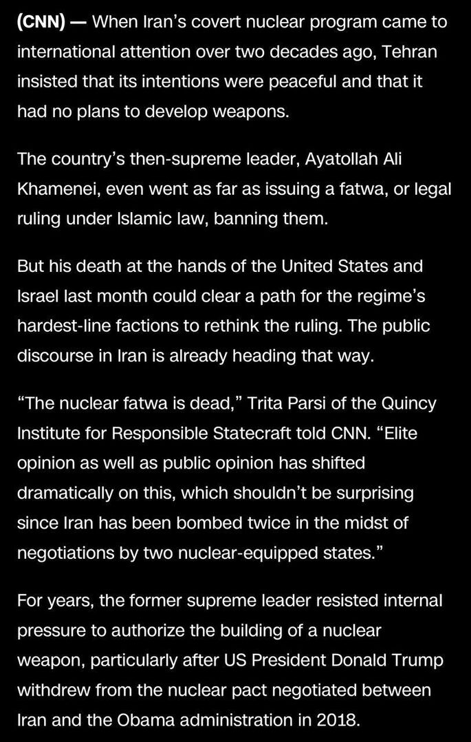 "Trong nhiều năm, cựu lãnh đạo tối cao của Iran, Ali Khamenei, đã phản đối áp lực trong nước nhằm phát triển vũ khí hạt nhân. Ông thậm chí còn ban hành một sắc lệnh tôn giáo (fatwa) cấm hành động đó. Ông Khamenei cha từ chối vượt qua ranh giới giữa làm giàu uranium và chế tạo bom hạt nhân." Nhưng sau vụ ám sát ông bởi Israel và Mỹ, sắc lệnh này được cho là đã mất hiệu lực.