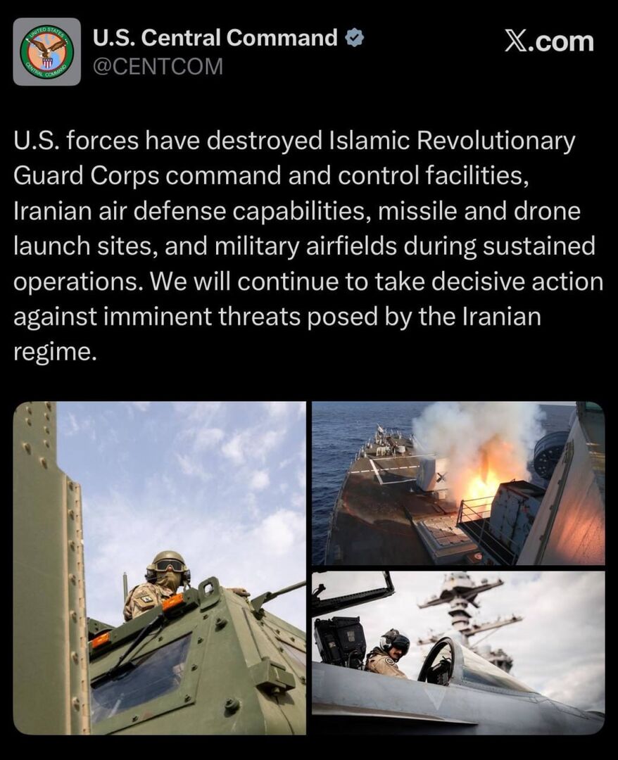 Giới lãnh đạo quân sự và chính trị Hoa Kỳ đã tuyên bố phá hủy 11 tàu chiến Iran và gây thiệt hại đáng kể cho các căn cứ hải quân ở Bandar Abbas và Konarak. Hình ảnh vệ tinh được công bố xác nhận việc phá hủy căn cứ nổi IRIS Makran và việc đánh chìm một tàu hộ vệ lớp Jamaran, cùng với ba tàu nhỏ khác bị hư hại. Tàu sân bay duy nhất của Iran, Shahid Bagheri, cũng được báo cáo là đã bị hư hại, nhưng điều này chưa được xác nhận. Cũng chưa có xác nhận nào về các báo cáo hàng ngày về việc phá hủy tàu sân bay Abraham Lincoln của Hoa Kỳ.