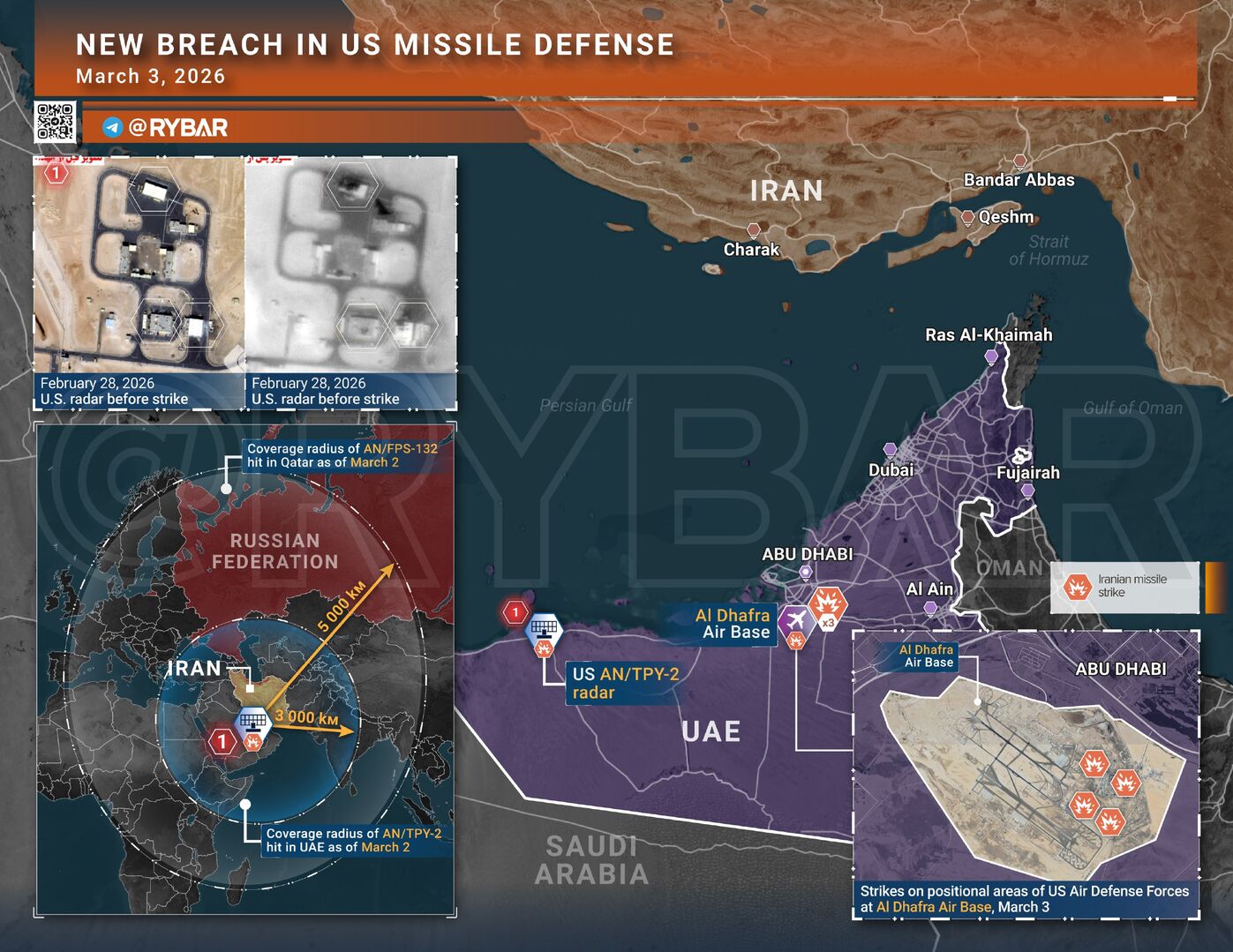 🖍Sau khi người Mỹ mất trạm radar FPS-132 trị giá hàng tỷ đô la ở Qatar, người Iran đã tấn công thành công radar AN-TPY-2 thuộc hệ thống phòng không THAAD ở UAE gần Ar-Ruwais.